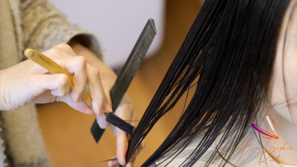 Nous commencerons par un shiatsu crânien afin de s’abandonner à l’instant présent plus profondément. Ensuite j’utilise un rasoir traditionnel qui va émettre des vibrations le long de la fibre capillaire jusqu’à la racine.